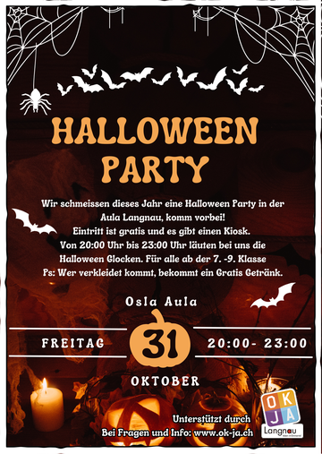 Am Freitag, 31. Oktober, laden wir alle Jugendlichen der 7. bis 9. Klasse herzlich zur Halloweenparty in der OSLA-Aula in Langnau ein!